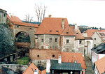 Vstup na Horní hrad totiž znesnadňoval druhý hradní příkop; v gotickém období byl řešen schodišťovou věží, která byla spojena s palácem dřevěným mostem v patře. Jádro této gotické schodišťové věže dnes tvoří objekt Máselnice (Zámek č. p. 59 - Máselnice), která po renesanční úpravě sloužila k výrobě másla a ke zpracování mléčných výrobků pro potřeby zámecké kuchyně. Současná sgrafitová fasáda budovy byla opravena v roce 1989. V letech 1575 byl přístup k Hornímu hradu rozšířen do dnešní podoby (Chodba spojující II. a III nádvoří zámku Český Krumlov), přičemž padací most byl zrušen v polovině 17. století.