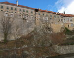Na upraveném a místy otesaném skalním masivu jsou pod nádvořím vícepodlažní klenuté sklepy, stavěné jako spolehlivý základ pro zdi palácových stavení, které dosahují výšky až několika desítek metrů. Pouze na několika místech, a to především ve východní části Horního hradu, jsou dochovány doklady o gotické stavební fázi (Zámek Český Krumlov v období gotiky). Jedná se o kapli sv. Jiří a sv. Kateřiny, připomínanou poprvé roku 1334, a gotickou místnost nejasného určení vedle tzv. Románské komory. Ostatní prostory jsou výsledkem stavebních aktivit v 16., 17. a 18. století.
