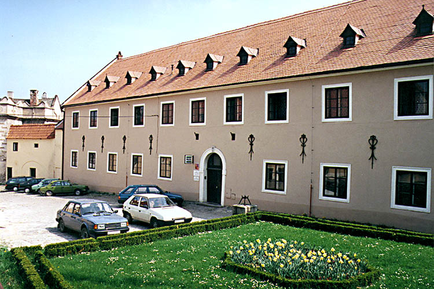 Při zámeckých schodech dále po levé straně stojí objekt Zámek č. p. 58 - Staré purkrabství, kde bydlel nejvyšší úředník a správce hradu. Složitá půdorysná dispozice objektu naznačuje etapy stavebního vývoje a obtíže přizpůsobit stavbu terénu. Část obvodového zdiva je gotického původu, renesanční fáze výstavby z 2. poloviny 16. století je patrná jak v interiéru, tak i exteriéru stavby. Severní a jižní část vypovídá o radikální barokní či klasicistní přestavbě ve 2. polovině 18. století. Směrem k zámecké věži je dochována část spojovací chodby, která vedla z Horního hradu do minoritského kláštera.