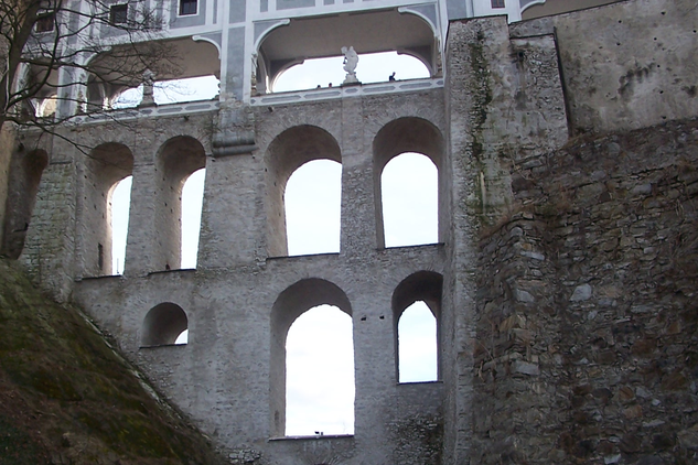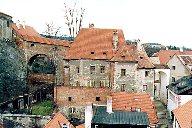 Portálem průjezdu z II. nádvoří zámku Český Krumlov, nad kterým jsou osazeny tři znaky - rožmberský, eggenberský a braniborský (Znaky v areálu zámku Český Krumlov), směřuje komunikace do prostoru tzv. Horního hradu (Zámek č. p. 59 - Horní hrad). Soubor palácových stavení obklopující III. a IV. nádvoří zámku Český Krumlov se vytvářel v jednotlivých stavebních etapách od poloviny 14. do 18. století. Přes složitý stavební vývoj si budovy uchovaly renesanční charakter z doby svého největšího rozkvětu ve 2. polovině 16. století za panování vladaře Viléma z Rožmberka (1535-1592). Charakteristický vzhled jim vtisklo působení architektů Antonia Ericera Vlacha, Baldassara Maggiho z Arogna či malíře Gabriela de Blonde.