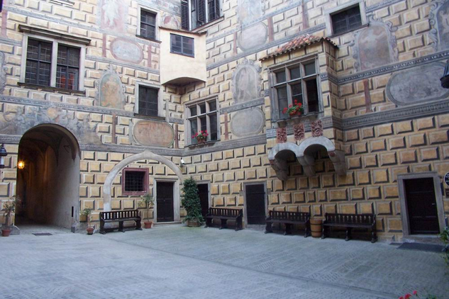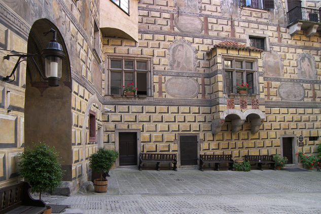 Soubor palácových stavení obklopující IV. nádvoří zámku se vytvářel v jednotlivých stavebních etapách od poloviny 14. do 18. století. Přes složitý stavební vývoj si budovy uchovaly renesanční charakter z doby svého největšího rozkvětu ve 2. polovině 16. století za panování vladaře Viléma z Rožmberka (1535-1592). Charakteristický vzhled jim vtisklo působení architektů Antonia Ericera Vlacha, Baldassara Maggiho z Arogna či malíře Gabriela de Blonde. Charakter velkorysé a monumentální renesanční rezidence nejen že nebyl stavebními úpravami 17. a 18. století setřen, ale naopak byl respektován. Mimo jiné o tom svědčí malby fasád obou nádvoří znázorňující alegorické a mytologické výjevy a osobnosti z řeckých a římských dějin. Malby vznikly kolem roku 1588. Jejich autor není znám, ale podle způsobu provedení pocházel malíř pravděpodobně z Francie nebo z jihozápadního Německa. Práce na fasádách v 17. a 18. století nevedly k jejich likvidaci, pouze byly v letech 1909 až 1912 zčásti zrestaurovány a doplněny schwarzenberským restaurátorem Theofilem Melicherem. Horní hrad má pro návštěvníky zámku zvláště velký význam, neboť jsou zde zpřístupněné interiéry ve dvou prohlídkových trasách.