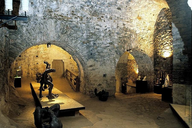 Na upraveném a místy otesaném skalním masivu jsou pod nádvořím vícepodlažní klenuté sklepy, stavěné jako spolehlivý základ pro zdi palácových stavení, které dosahují výšky až několika desítek metrů. Interiéry tří pater zámeckých sklepů s výstavou keramické tvorby jsou zpřístupněny návštěvníkům.